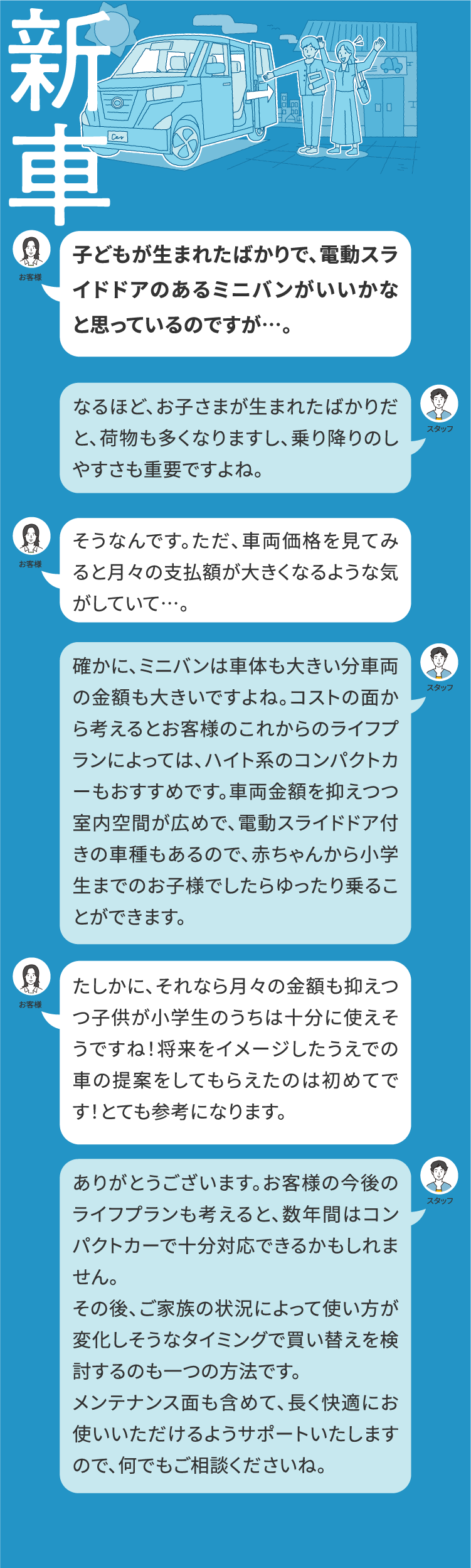 国内全メーカー取り扱いということで、NBOXとタントの見積もりをだしていただき最終的にタントカスタムにしました。実車も用意していただけて2台比べられたのが良かったです。これから宜しくお願いします。