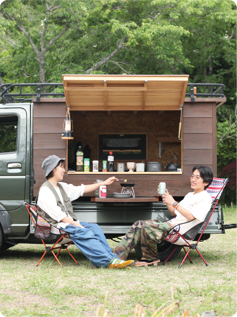 木材を使用し温かみのある内装に仕上あげ、外装は今大人気のジムニー仕様に仕上げました‼特に気仙沼の方が子供と一緒にワクワクしながら思い出をつくって欲しいという想いで作製しました。