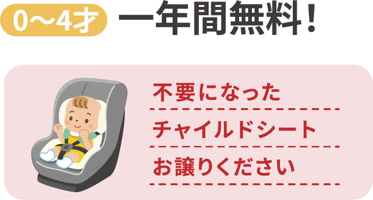 チャイルドシートを1年間無償でレンタルするサービスです。成長の早い子供だから、実質3〜4年位のチャイルドシートを自分で購入せずレンタルすることで家庭にかかる負担を少しでも減らせればと思います。