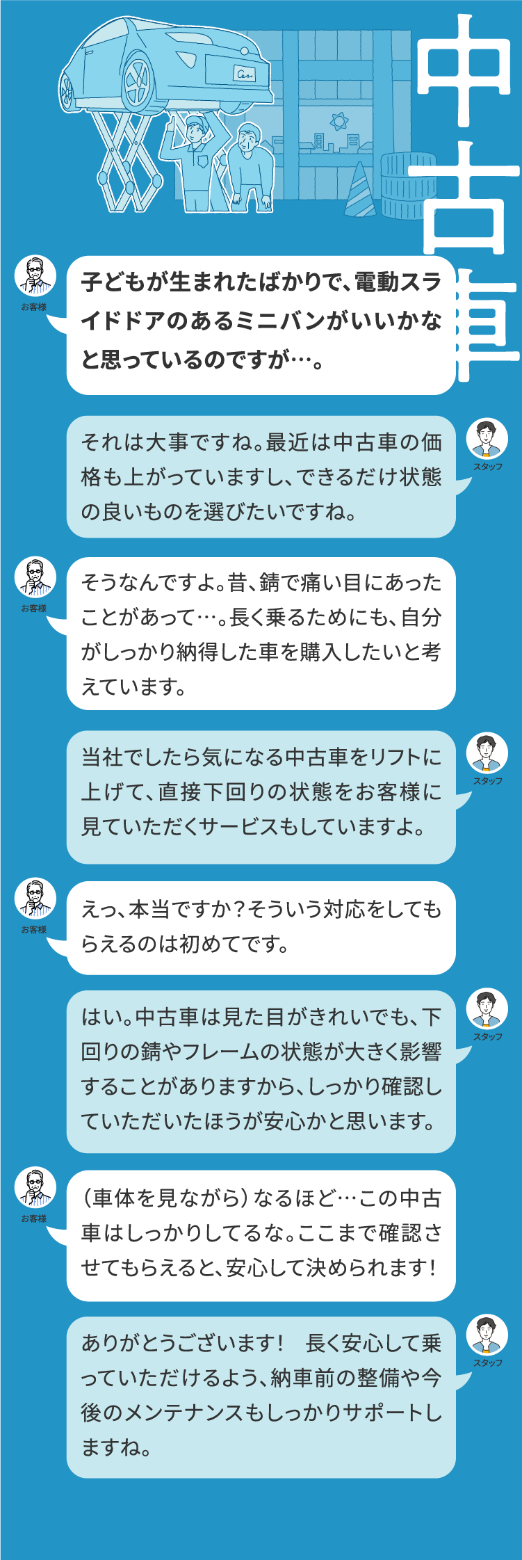 親の紹介で初めての車を購入しました。今後のメンテナンスで気を付ける所など聞けて良かったです。これからオイル交換の時期を意識して大事に乗ります。お父さんの車も私の車もこれからもお願いしますw